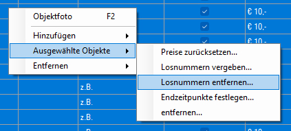 Sie können bestehende Losnummern in Ihrer Auktion entfernen; die betroffenen Lose bleiben der Auktion zugeordnet, haben dann aber keine Losnummern mehr. Um das zu tun, wählen Sie die gewünschten Zeilen aus. Anschließend klicken Sie auf die Schaltfläche "Ausgewählte Objekte" (rechts oben) und wählen die Menüoption "Losnummern entfernen":