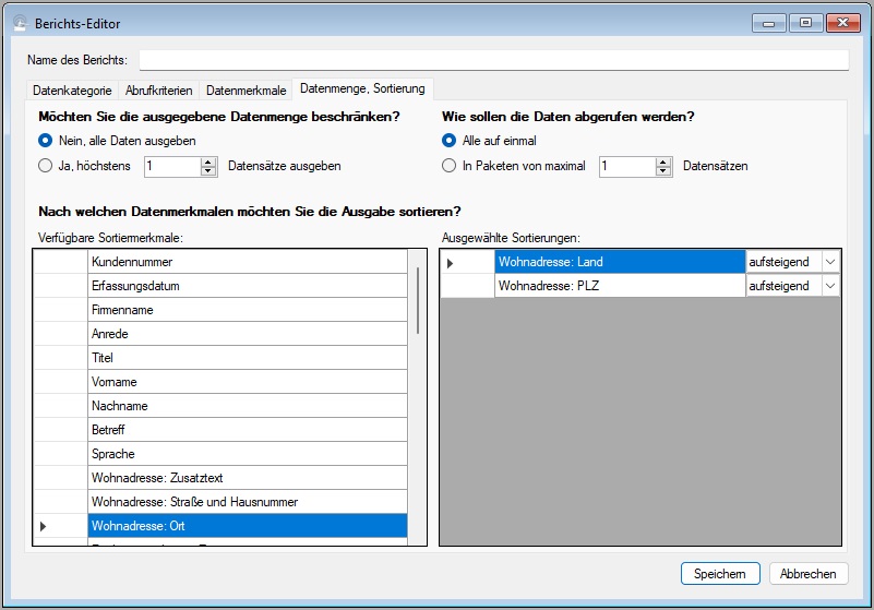 In den vergangenen Beiträgen hatten wir mit einem Bericht gearbeitet, der für alle Personen namens Meier (oder so ähnlich) in Deutschland und Österreich Kundennummer, Namens- und Adressdaten auswirft. Was wir noch nicht definiert haben, ist die Sortierung der Daten. Das geschieht im Reiter "Datenmenge, Sortierung":